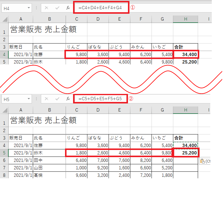 上の①が最初に作った数式で、下の②がコピーして貼り付けた数式。数式内の4という数字が、貼り付け後は5に変わっています。これが【相対参照】です。要は貼り付け先がコピー元の一つ下なら、数式内のセルも全て一つ下に勝手に変わります。上下左右のどこへ貼り付けても同じように上下左右が変化した数式になります。