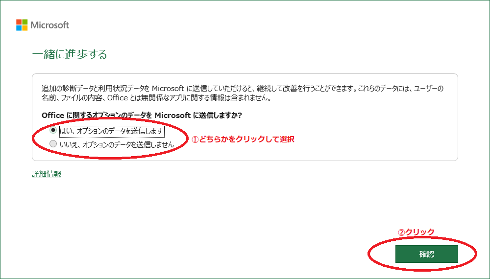 ⑤利用状況データなどをMicrosoftへ送信するかどうかの設定。お好みで選択して確認ボタンをクリックする。ちなみに私は「はい」を選択しました。